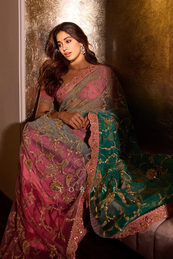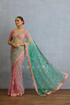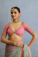 The Sagar Poshaki Angia Saree is crafted with sheer butterfly net fabric, in the shades of pink and aqua blue. It is carefully embroidered with traditional dori work, sequins. heritage cutdana and badla work, along with pearl embellishments. The jaal style of the saree is an ode to the traditional craftsmanship of Indian ensembles.