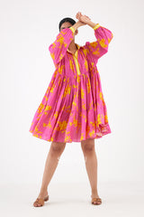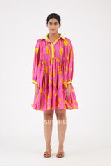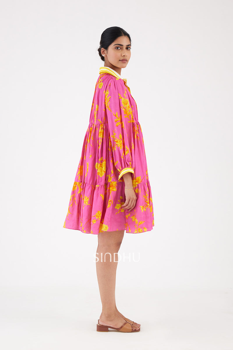 Swing to the beat of your own drum in this relaxed, tiered short dress in our signature Hot Pink with Marigold florals, styled with a shirt collar.