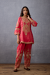 This Gul-Kand Saroj Kurta Pants is crafted in luxurious Silk Crepe and cotton voile fabrics, featuring exquisite hand embroidery, Gota detailing, Zari embroidery. Its bold, fiery pink hue gives it a unique look, while the intricate hand adda work completes the set. Including a kurta and pants, this ensemble is perfect for special occasions!