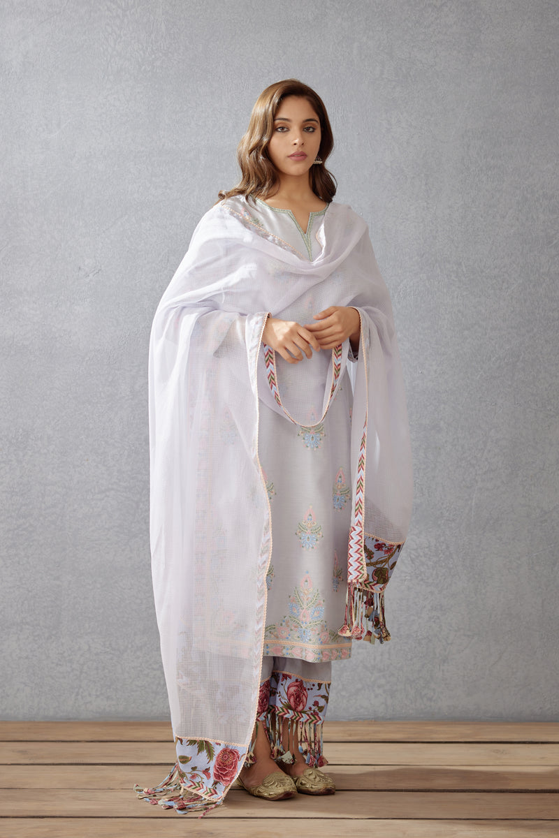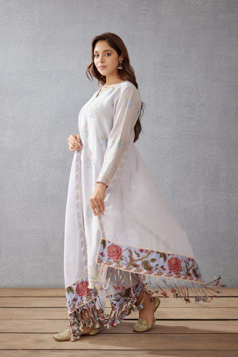 Experience the beauty of the Samsara Falgun Odhni. Crafted with pure Cotton Kota, this rich powder Blue Odhni features intricate Hand Block Printing and heavy tassels for a vibrant and eye-catching look. Add the perfect finishing touch to any outfit with this stunning piece.