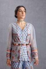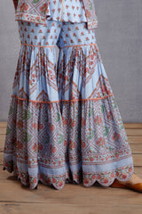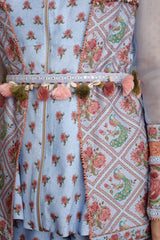 Experience elegant luxury with our Samsara Haniya Co-ord Set. Crafted from Handwoven Chanderi, Silk Organza, Cotton Voile, and Cotton Silk, this gorgeous set is digitally printed, hand embroidered, and hand worked for sophisticated style. The stunning sea blue chintz print on the double layered jacket pairs perfectly with the coordinating sharara for a truly timeless look.