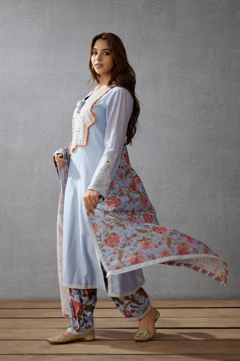Featuring a stunning sea blue Chintz print and thin mirror border in Handwoven Chanderi fabric, the Samsara Paakizah Odhni is a luxurious pick for special occasions. Crafted with Digital print, Machine embroidery, and Hand Adda work, this Odhni is sure to add an exquisite touch to your look.