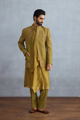 Enhance your wardrobe with the Samze Arsh Jacket. Crafted from a luxurious Jeni silk, this jacket is highlighted with a stylish and sophisticated combination of traditional doria and dabka work. Available in a timeless green, the piece can add the touch of richness and luxury to any outfit.