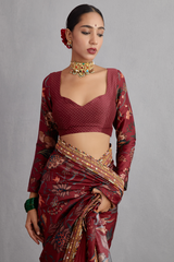 The Sanobar Revathi Blouse is crafted from luxurious handwoven Chanderi and Cotton Silk fabrics. Boasting a beautiful wine hue, this must-have blouse is sure to elevate any wardrobe. Its finely crafted details make it an ideal addition to any wardrobe.