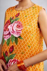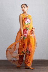 This Santree Ikjot Kurta Set provides you with luxurious comfort and style. Featuring a soft and breathable linen and silk satin blend, this set features a striking orange color and delicate digital print. Its unique design and fabric make it the perfect choice for special occasions.