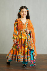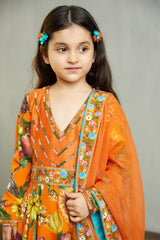 Our Santree Mastani Anarkali Set is made from a high-quality blend of Cotton Silk, Cotton Voile and Silk Organza fabrics. It features a beautiful digital print punctuated with hand adda and block print embellishments in a vibrant orange hue. This set includes an Anarkali, Churidar and Odhani - perfect for traditional occasions.