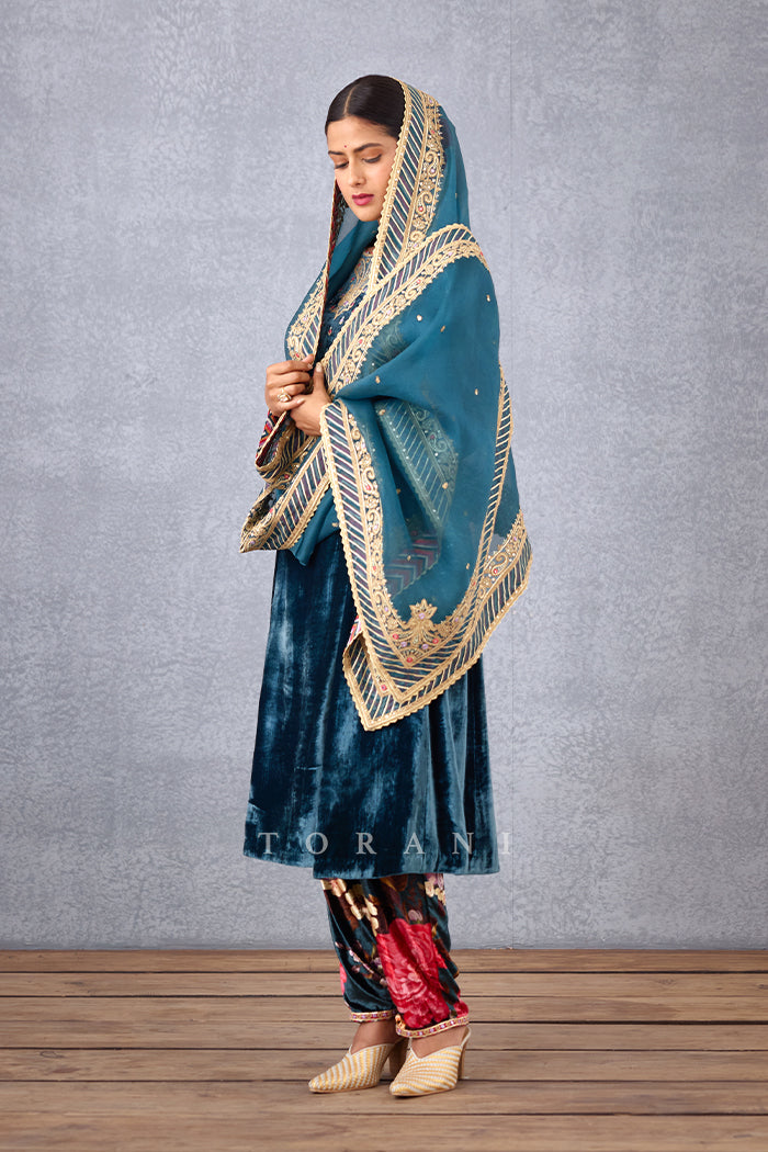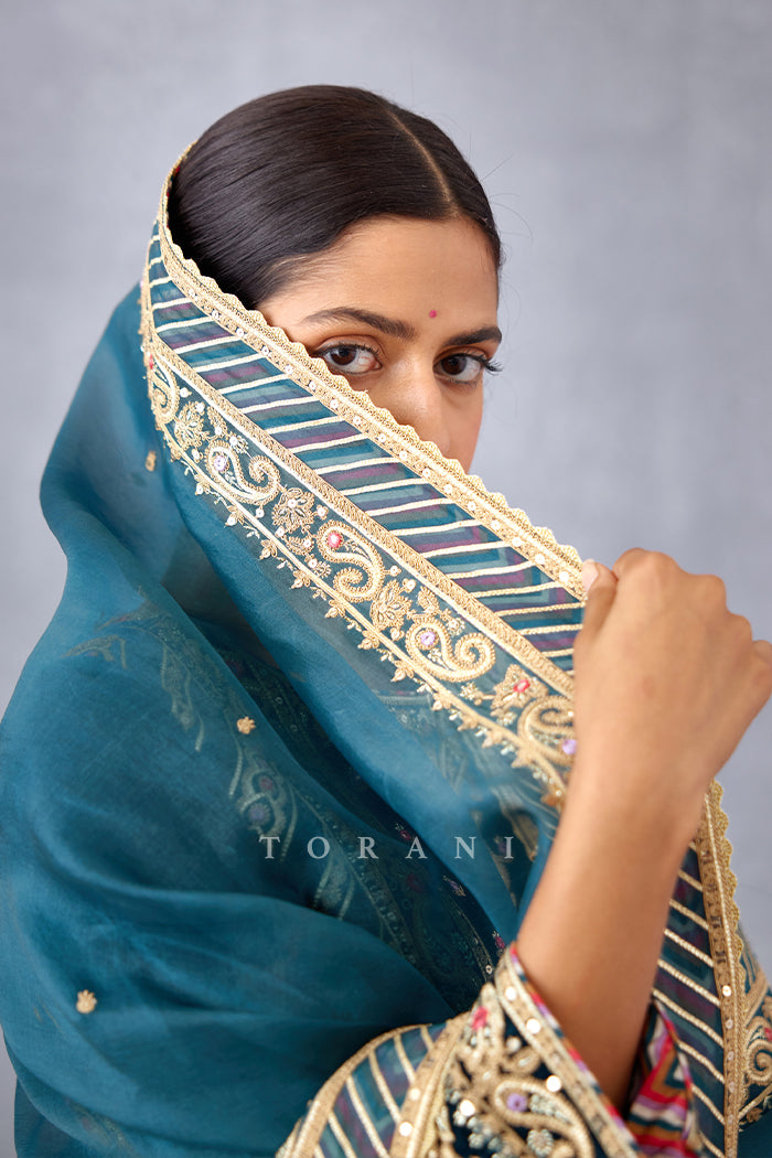 Stay cool and comfortable during your outdoor activities with Shabnami Qurbat Odhni. Crafted from lightweight Silk Organza, this exquisite Odhni features intricate detailing such as Hand-embroidered Gota work and digital prints. Its beautiful blue hue adds a pop of color to any look.