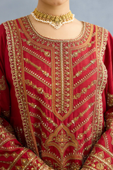 The Shamse Leela Abho and Jama Kurta Set is a stunning tribute to Indian craftsmanship. Crafted from the finest jeni silk, the regal red shade exudes unmatched elegance. Adorned with intricate layers of dori embroidery and heritage kiran badla, this Kurta Set is a true vision of luxury.