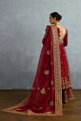 Wrap yourself in luxury with the Shamse Raazi Odhni. Made of the finest Organza and highlighted with intricate Doria and Dabka, this regal red shade adds a statement of beauty to any outfit.