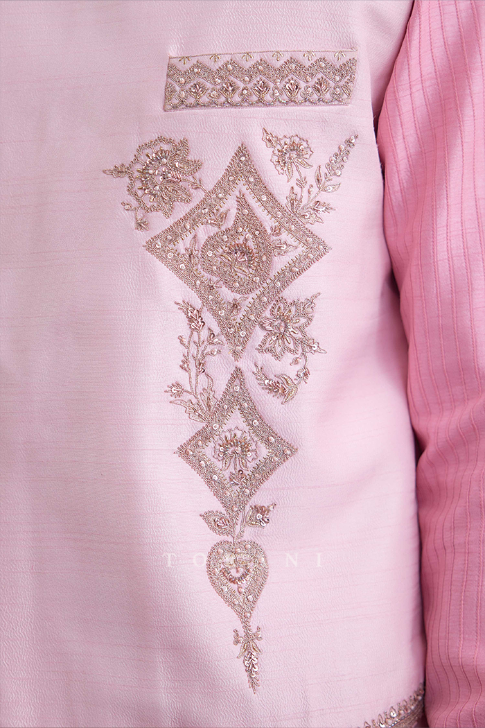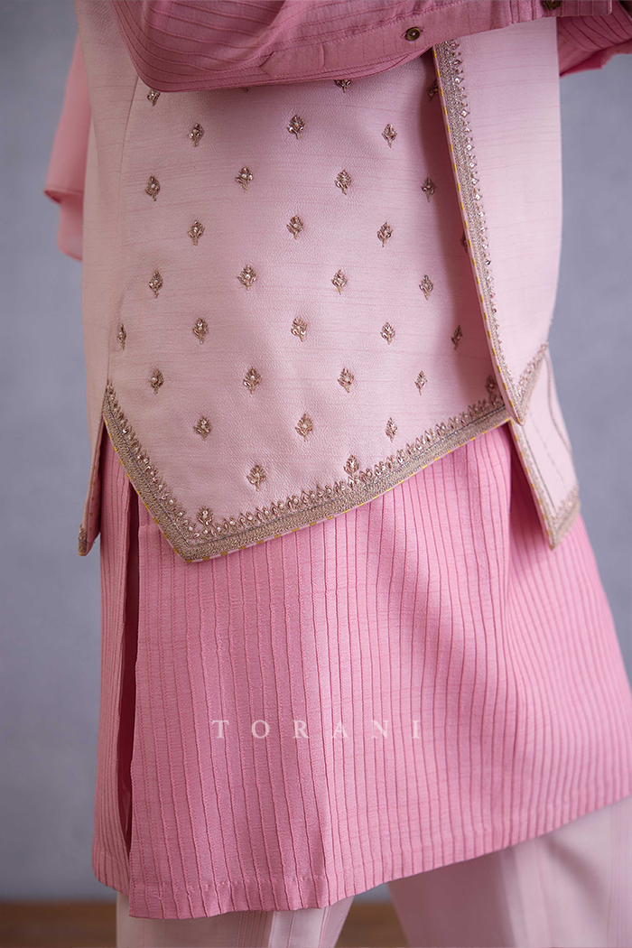 The Sharbati Ruhaan Bandi is an exclusive piece to style on your special occasions. It is crafted with a luxurious jeni silk fabric and features embroidered details that ensure that you have the spotlight on you at all times.
