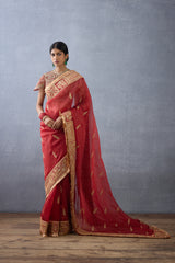 Stand out in the crowd with this stunning Sindoori Amruta Saree. Crafted from a luxurious blend of raw silk and cotton silk fabric, it's carefully hand embroidered with dori embroidery and hand adda work. The red hue radiates grace and style, making it the perfect saree to wear for special occasions.