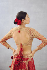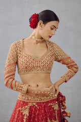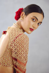 This Sindoori Arohi Blouse is an epitome of grace. Crafted from a luxurious blend of sheer butterfly net and silk organza, it is beautifully adorned with intricate hand embroidery, dori embroidery, and hand adda work. It is available in mesmerizing red color to make you the center of attention.