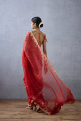 Experience traditional elegance in this beautiful Sindoori Nayantara Saree. Crafted from luxurious silk organza, it features intricate hand embroidery, dori embroidery, and hand adda work - all in a bright red colour for an eye-catching look.