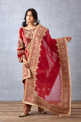 Experience luxury and traditional artistry with this Sindoori Priyala Makhmal Kurta Set. Crafted in exquisite silk velvet, cotton voile and sheer silk organza, the set features a bright red, golden embroidered short kameez with salwar and a dupatta to complete the look. Intricately detailed with hand embroidery, dori embroidery and hand adda work, this set flaunts a loose fit and is sure to make an impression.