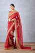 The Sindoori Taashi Saree is a special piece, expertly crafted with silk organza and embellished with chevron lace, hand embroidery, dori embroidery and hand adda work. Boasting a bright red hue, this sheer saree is perfect for special occasions and its sequin worked detail adds a beautiful sparkle.