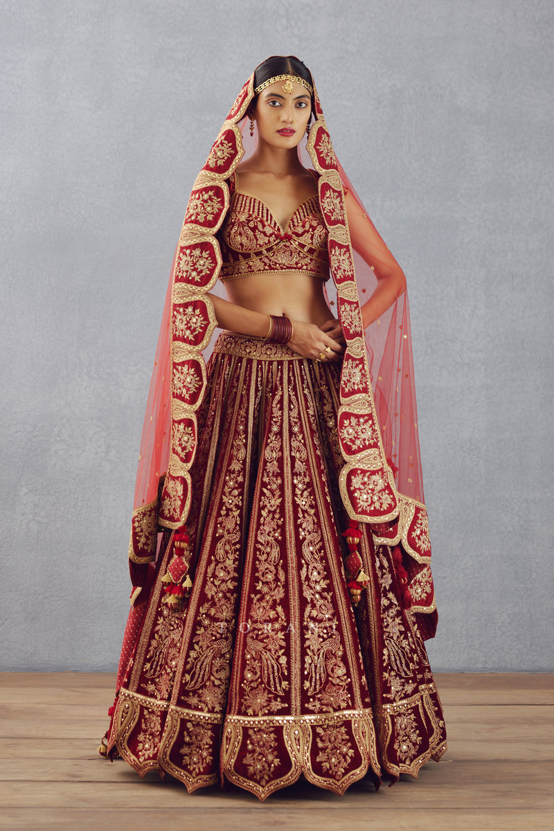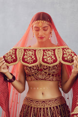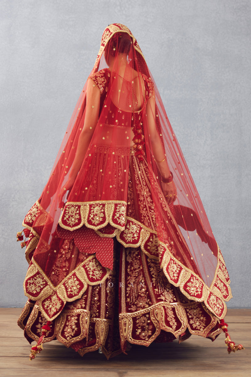 This Sindoori Turvi Odhni makes a stunning statement. Crafted from Sheer Butterfly Net fabric in a vibrant red hue, it is embellished with intricate Hand embroidery, beautiful Dori embroidery, and unique Hand Adda work. The broad temple border is the perfect finishing touch.
