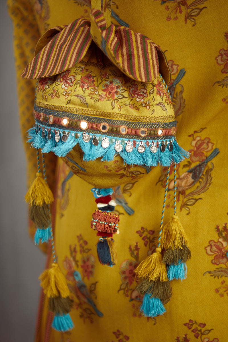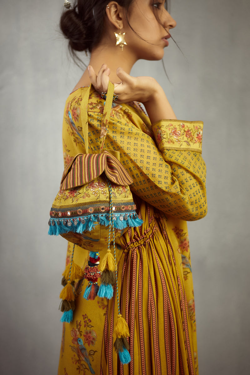 The Sunehra Sindhi Sheesha Potli is an exquisite piece of craftsmanship, expertly designed with luxurious Handwoven Chanderi and Cotton Silk fabrics. Boasting a vibrant yellow color, the potli bag is adorned with Digital print, Hand embroidery and Hand Adda work, making it a beautiful addition to any ensemble.