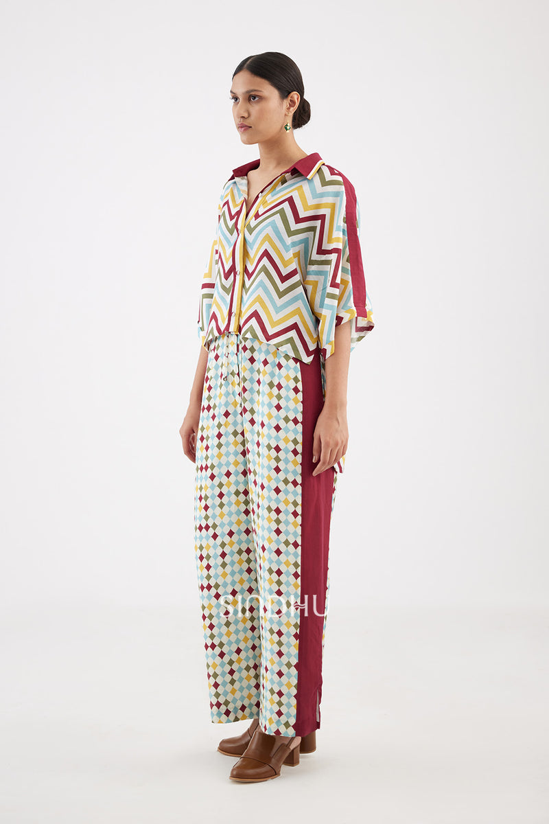High-low button-down shirt, enhanced with chevron, infused with candy hues and bold red stripe running across shoulders for an athleisure appeal. It is paired with our Anan Wide-leg Pants for a look that's quirky yet sporty.